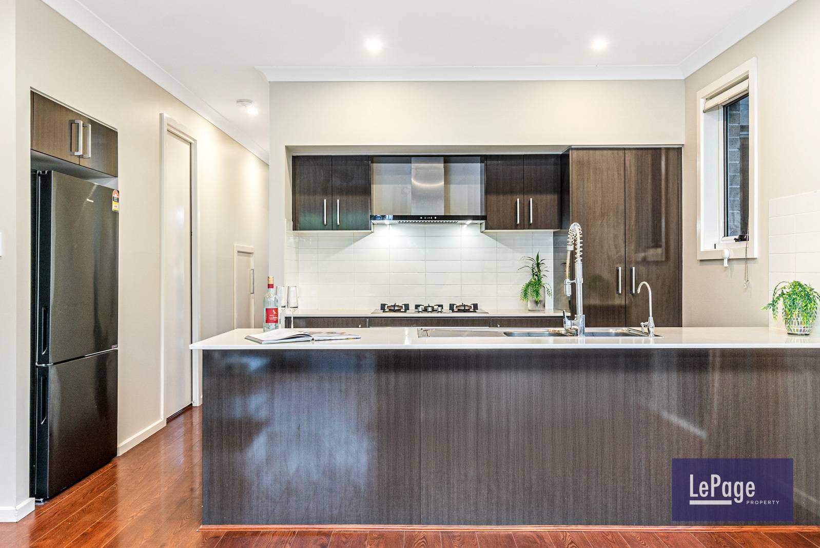 Jarrah laminated flooring throughout, gas heating, downlights, ceiling fans,