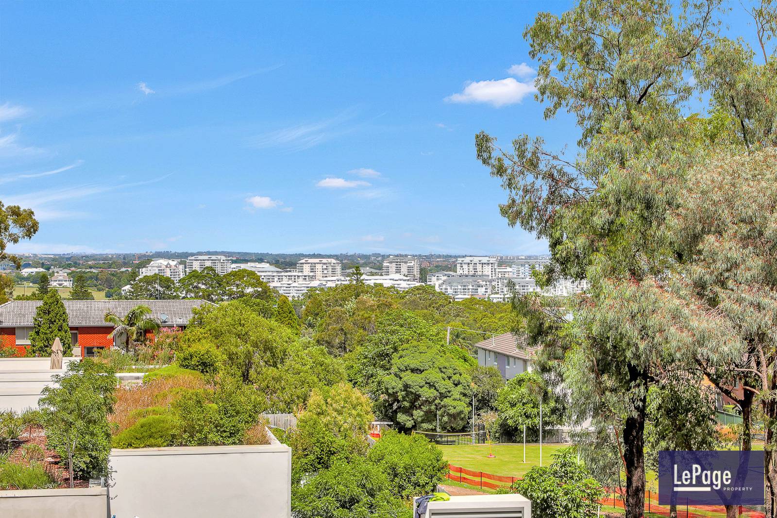 Sunlit balcony with garden/district views